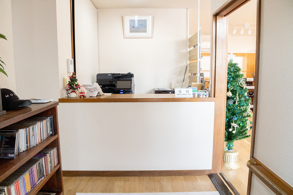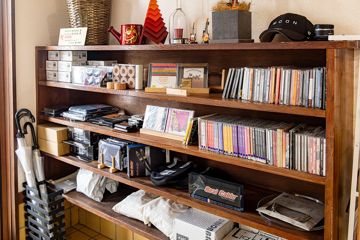 玄関ドアを開けるとクリニックのような受付がお出迎え。左手の棚にはアクセサリーやケーブル、そしてソフト類が並ぶ。その中には、ここでしか購入できないオリジナルのケーブルインシュレーターなどもあった。