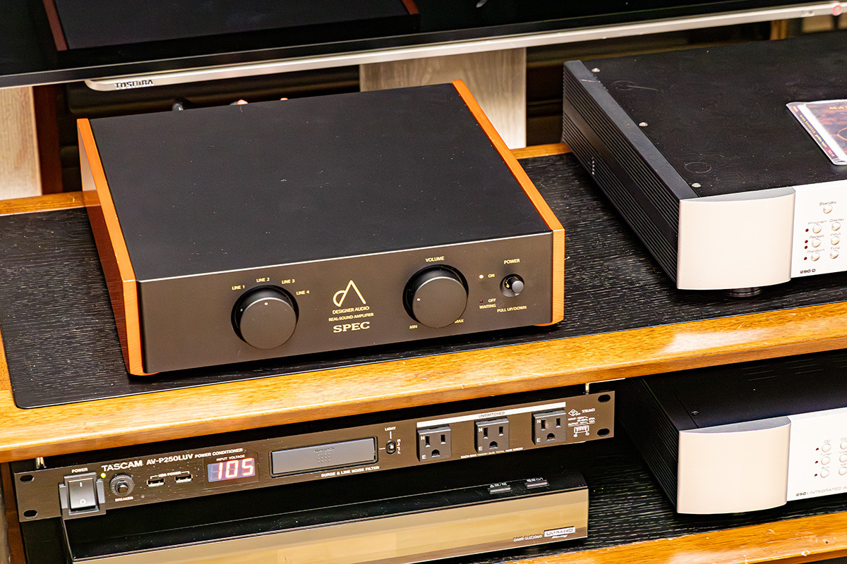 テレビを中心としたリビングオーディオをイメージしたスペースそのシステムの中には日本のオーディオブランド・SPEC(スペック)製品の姿も。「スペックさんから展示店舗が少ないという話を伺いまして、せっかくの機会ですのでここで展示しています」とのこと。スタックスのヘッドホンは以前の店舗からも引き続き展示。今後の展示製品についても検討を重ねているそうだ。