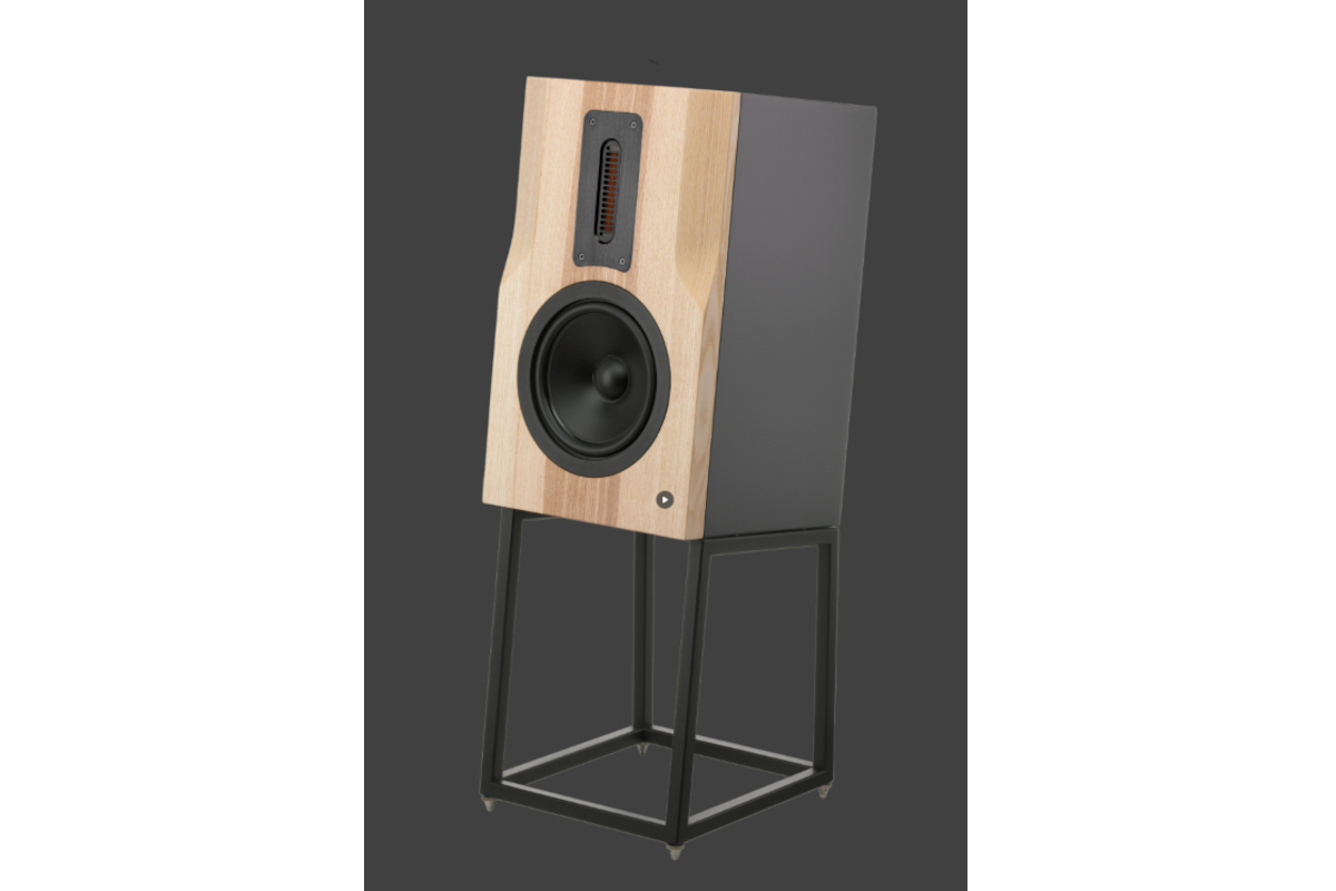 中低域は203mm径のオリジナル・パルプコーン(38mm径ボイスコイル)を搭載。大型マグネットと空芯コイルの組み合わせにより32Hz帯域までの低歪み再生を目指したという。専用スタンドはボックス型スチール製で高剛性、約5度の後傾を持つ一体構造。付属スパイクは304系非磁性ステンレス製で、床面保護のドーム先端への変更にも対応する。