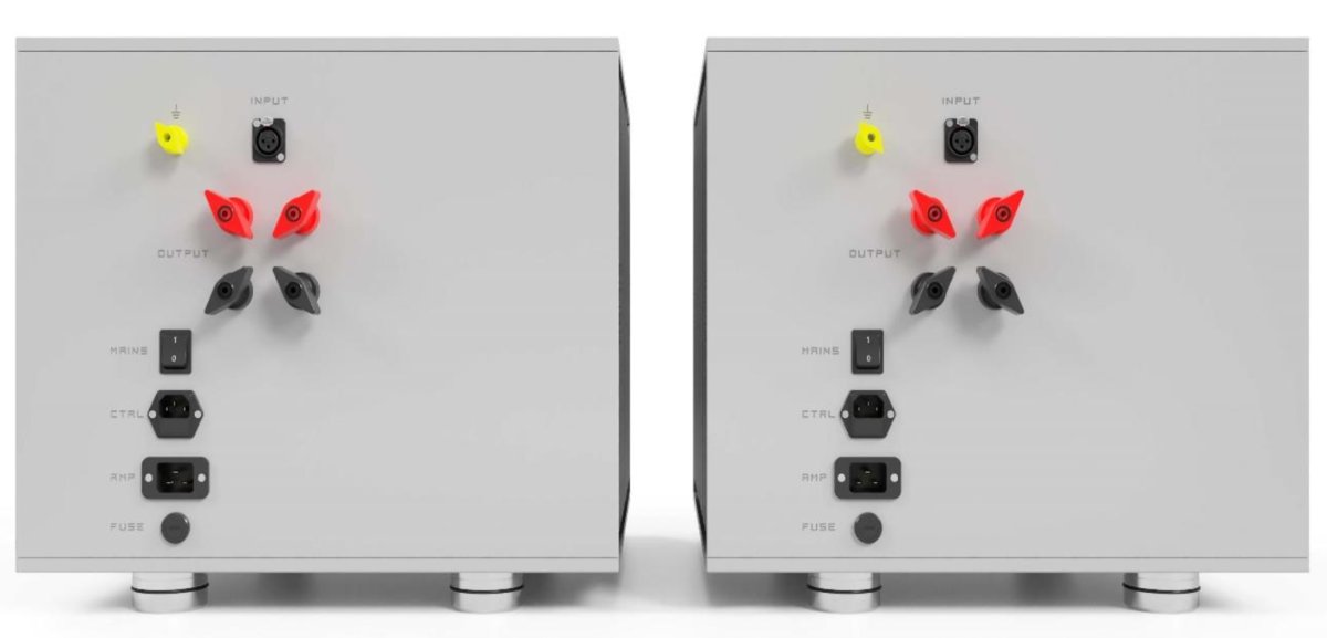 端子はXLRアナログ入力を1系統のみ備え、スピーカーターミナルは2組、グランド入力用バインディングポストを1系統。電源インレットはIEC 16AとIEC 10Aを独立して装備する。消費電力は最大2,500W、スタンバイ時62W。背面レイアウトは、左右に大振りのスピーカーターミナル、下段に各種電源端子を配している。