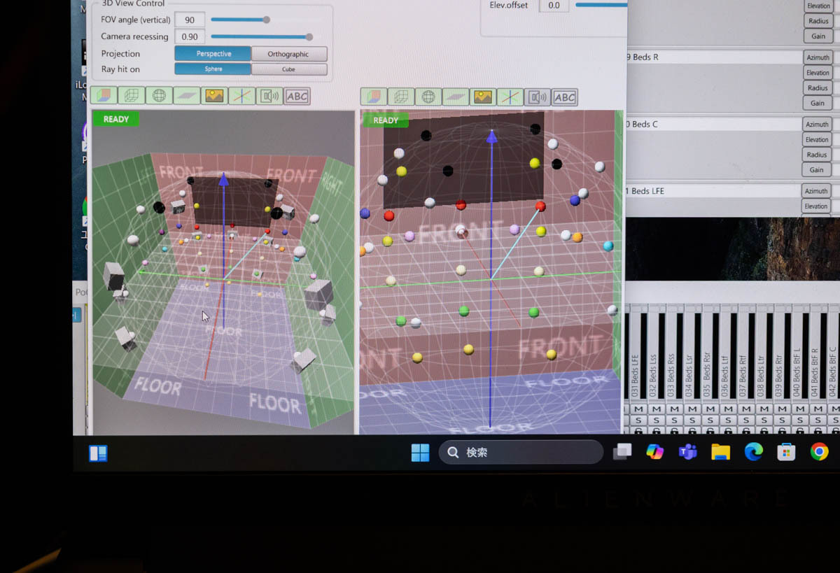 実際に360 Reality Audio のライブ用オブジェクト立体配置ソフトウェア上での配置をみると、360度の球面上に音の塊(オブジェクト)が配置されるのが見て取れる。そのことで、音の位置関係や楽器の質感などを、より解像度高くリスナーに届けることができるのだ。