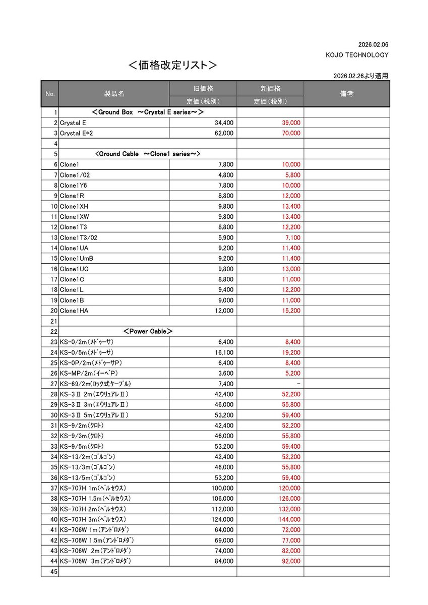 2026年2月26日受注受付分から新価格となり、前日2月25日までの受注分については従来価格での対応となる。