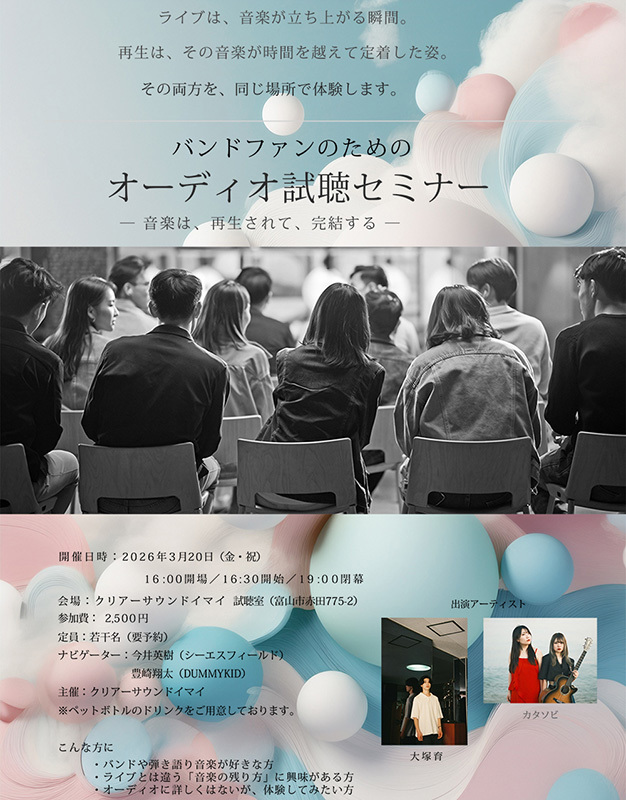 クリアーサウンドイマイ(富山市)は、「バンドファンのためのオーディオ試聴セミナー」を3月20日(金・祝)に開催する。電話またはメールによる完全予約制で、参加費は2,500円(税込)。