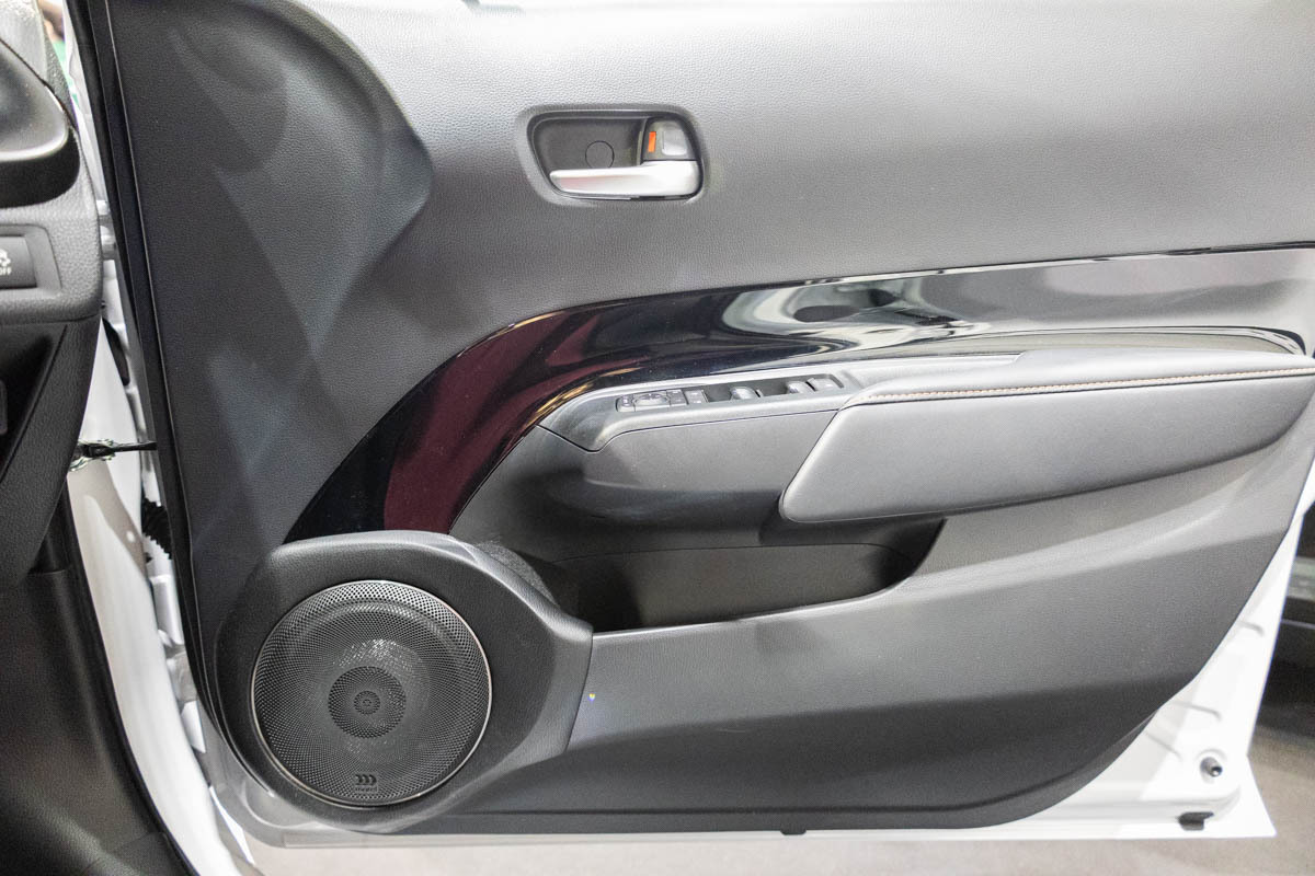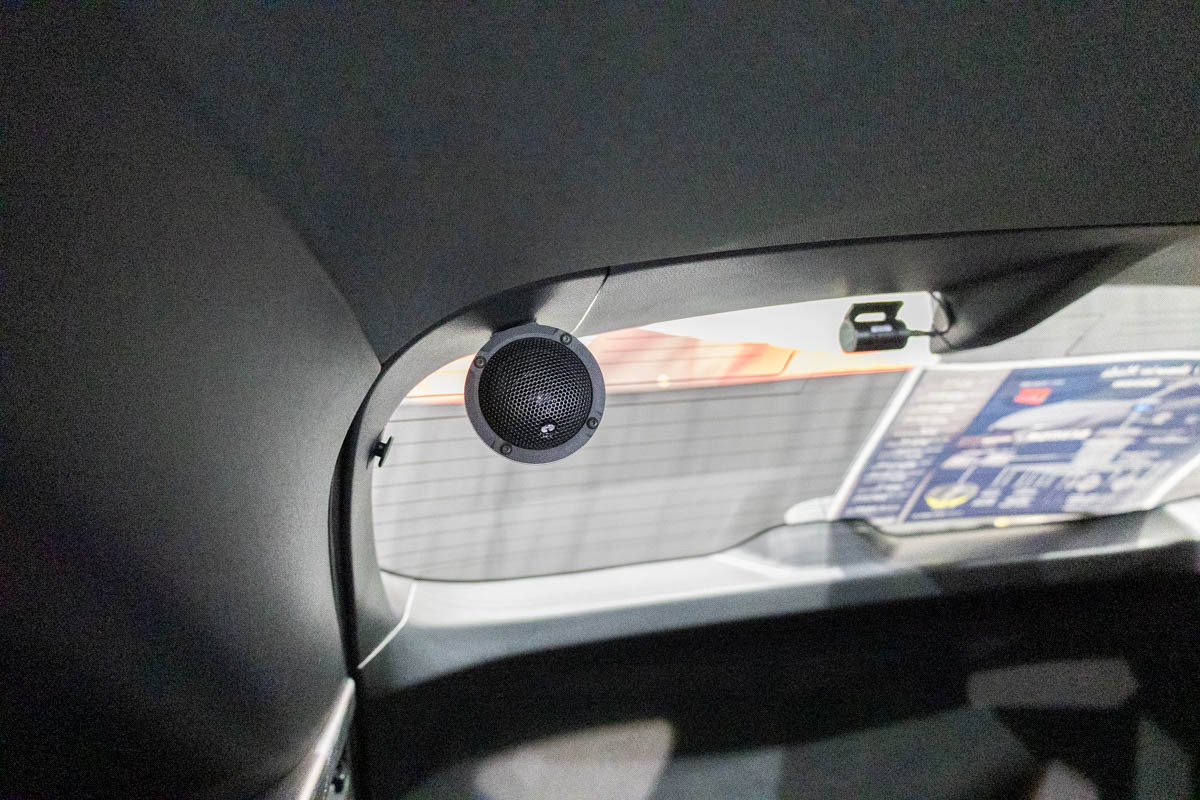 普通のステレオ音源もサラウンド的に楽しめることが特徴で、フロントに装着された3ウェイスピーカーのほか、天井やリア側にもスピーカーを装着。ヘッドユニットはディスプレイオーディオを活用しているため、YouTubeなどの音源も擬似的なサラウンド体験として楽しめる。スピーカー・アンプにはGroundZeroを活用したおおよそ1,200万円程度のシステムとなる。