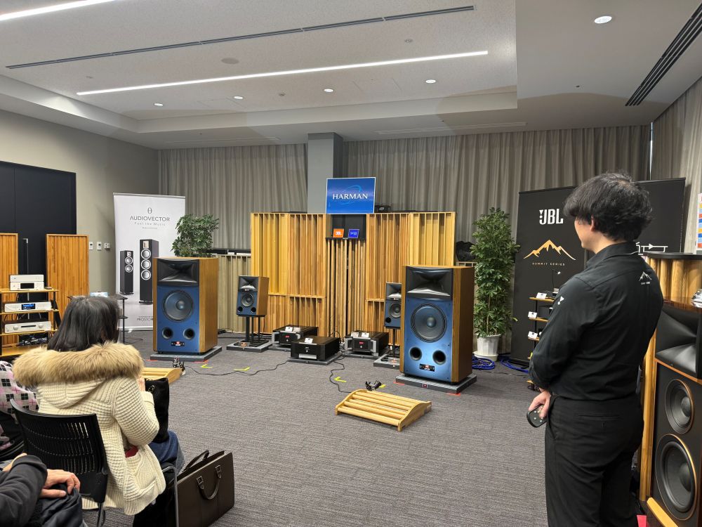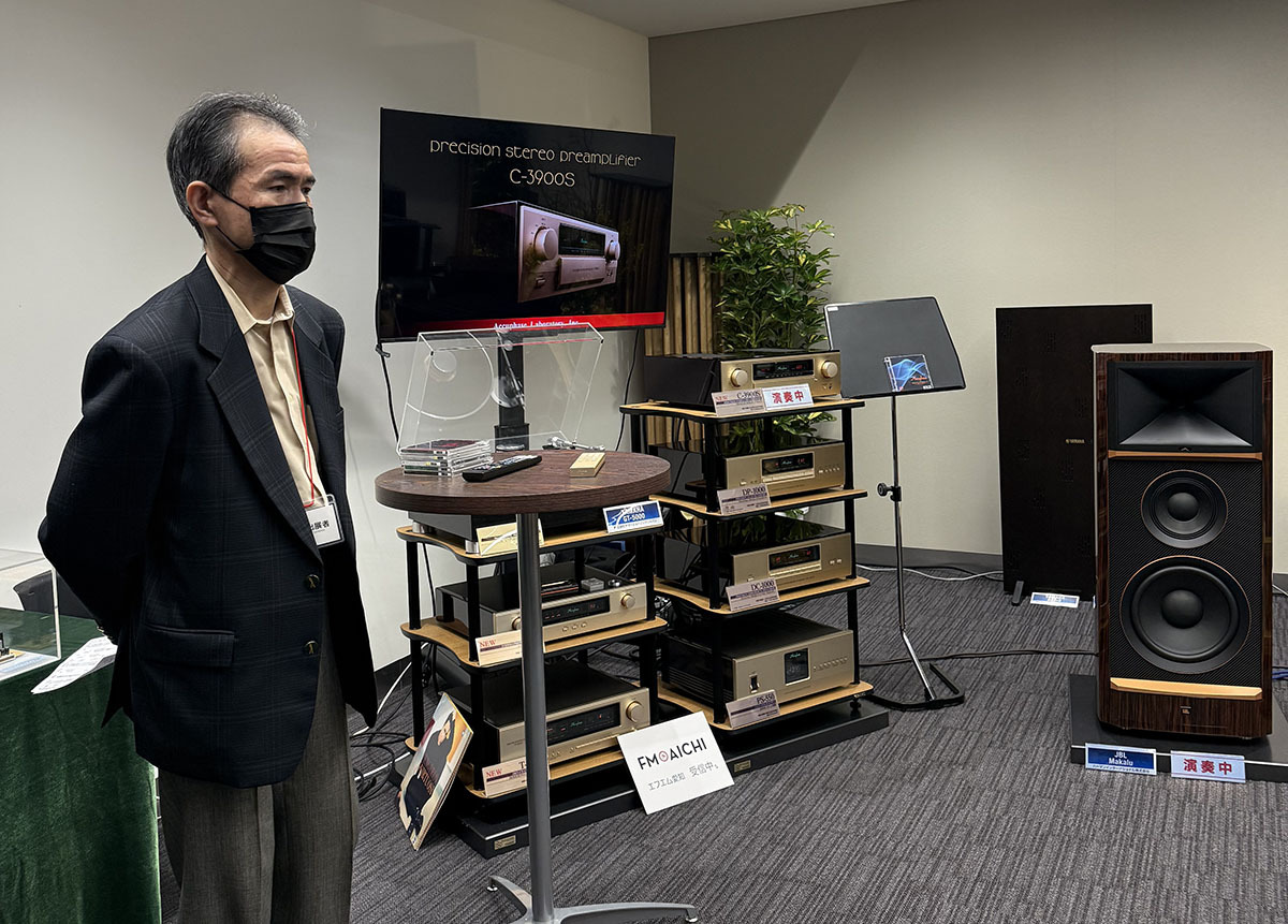モノラルパワーアンプ「A-300」やSACDトランスポート/プレーヤー「DP-1000 / DC-1000」、プリメインアンプ「E-800S」、FMチューナー「T-1300」などの主力システムが揃い、JBLのスピーカー、サミット・シリーズの「Makalu」を使用しての連続試聴を実施していた。