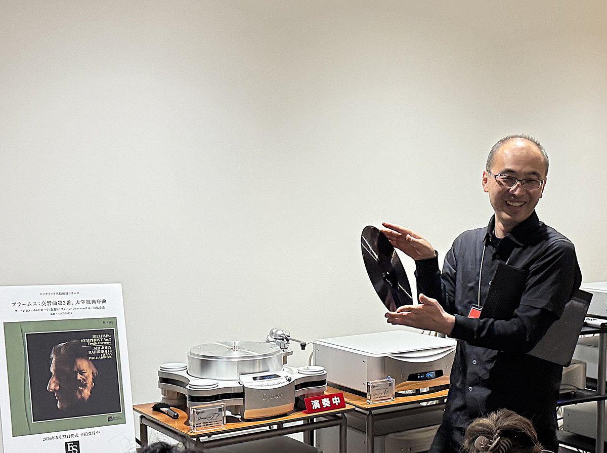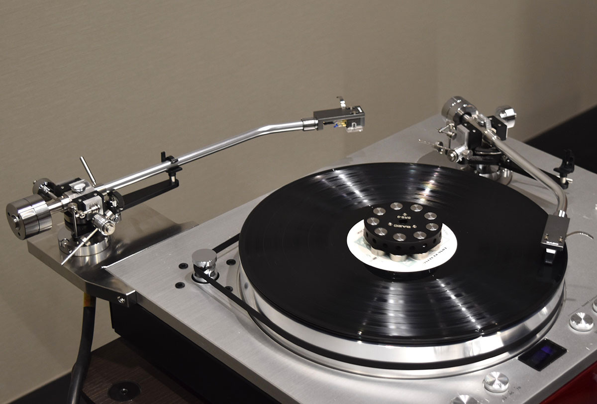 エソテリックは最高峰「Grandioso」シリーズのフルシステムが集結。アナログ再生はアナログプレーヤー「T1」とフォノイコライザー「E1」をメインに、5月23日に2タイトルが発売されるESOTERIC名盤復刻シリーズのアナログレコードを再生した。