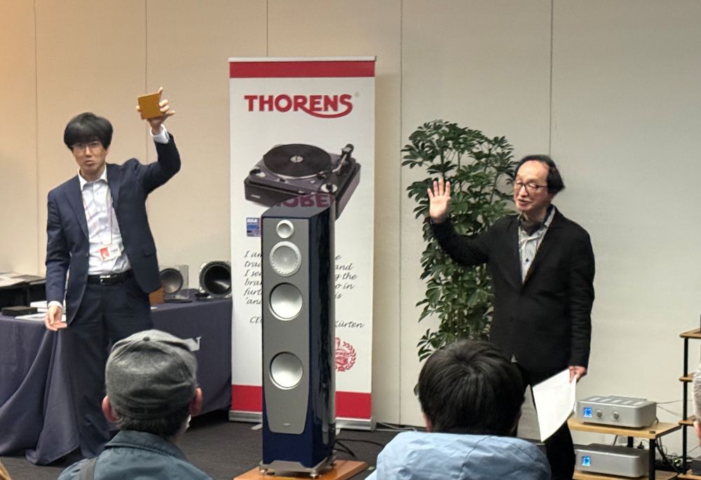 角田郁雄氏の講演も行われ、この講演中にこの「Persona 7」を自宅に導入したことも発表。オレンジ色に輝くカラーサンプルも公開した。さらに同社ではTHORENSのアナログプレーヤーやBluesoundと組み合わせ、ファンダメンタルのプリメインアンプ「aina」とのコラボイベントも実施した。