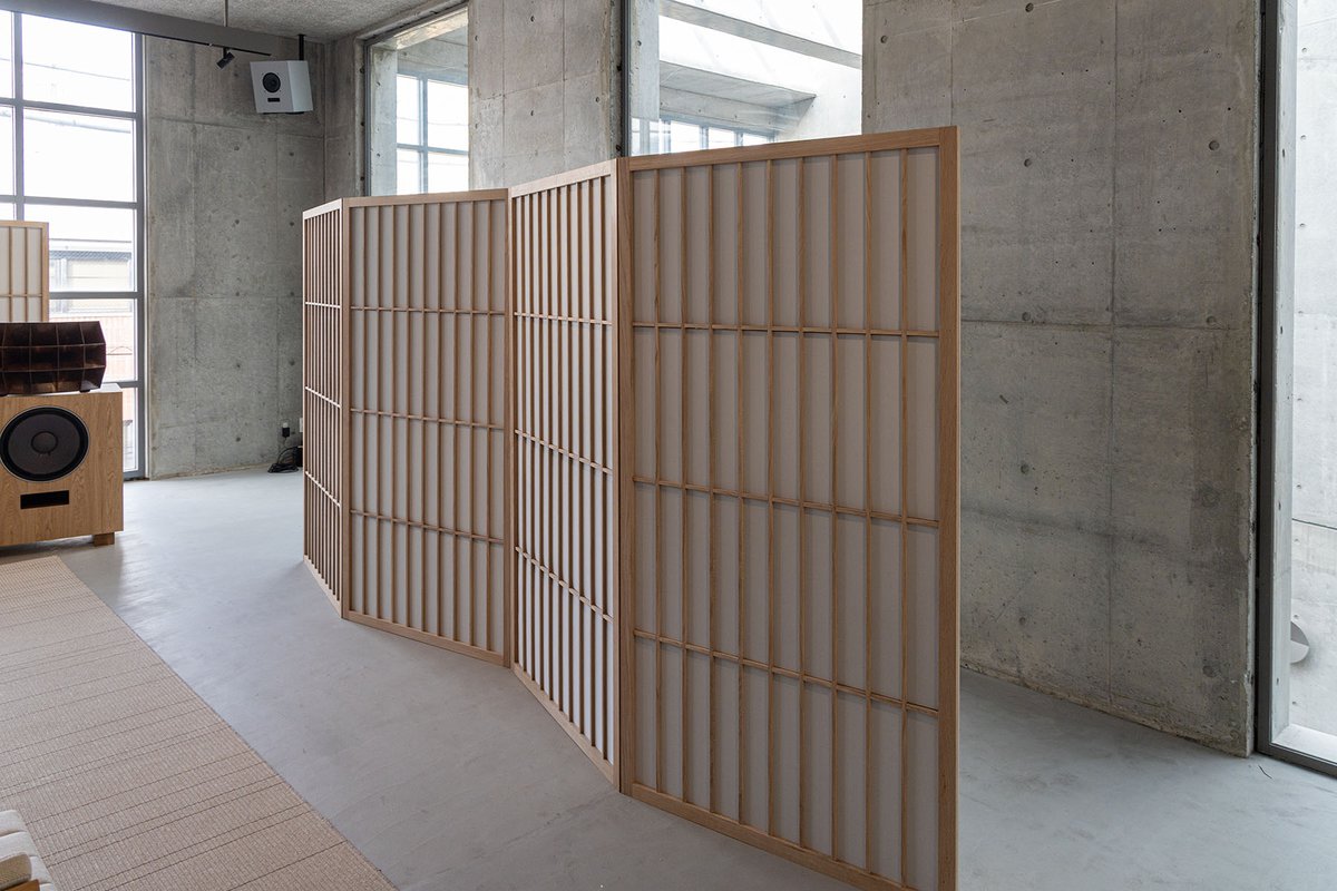 アコースティックパネルも検討。どこか屏風を彷彿とする和のテイストだ。吸音材には硬質のスポンジ材が使われているようだ。