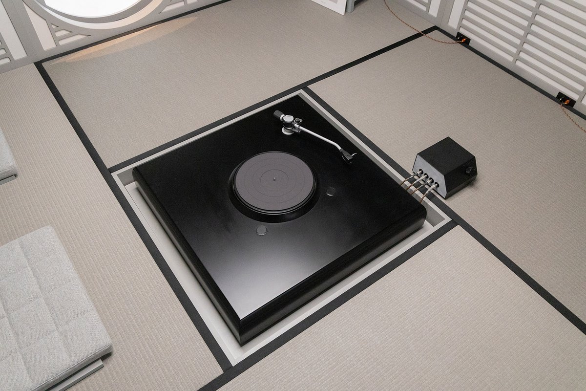 躙口を模したであろう狭い扉を潜り抜けて中に入ると、グレーで統一された茶室のような世界。壁は吸音パネルで構成され、中央にはデノン製フォノモーターとオルトフォンのロングアーム、SPUからなるアナログプレーヤーを配置。Rokujoと対峙する形で3席の座椅子が並べられ、主人(デヴォン氏)がかける音楽に対峙するという世界。どこか茶道にも似た雰囲気だ。