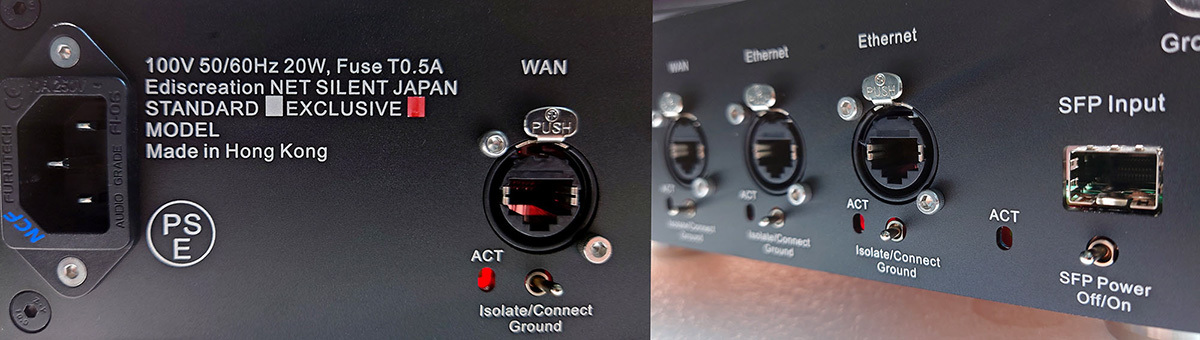 リアパネルにPSE マークを取得(左)/SFPモジュールを使わない時はパワーオフにできる(右)