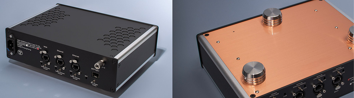 ルーターにおいて世界初を謳うグランドアイソレーション・スイッチは、ルーターやモデムなど上流機器からの接地ループノイズを効果的に遮断することで、音楽再生のバックグラウンドを大幅に改善。インターフェースには1000Mbps LANポートを3基と、光ファイバー入出力のための独立したSFPポートを1基備える。
