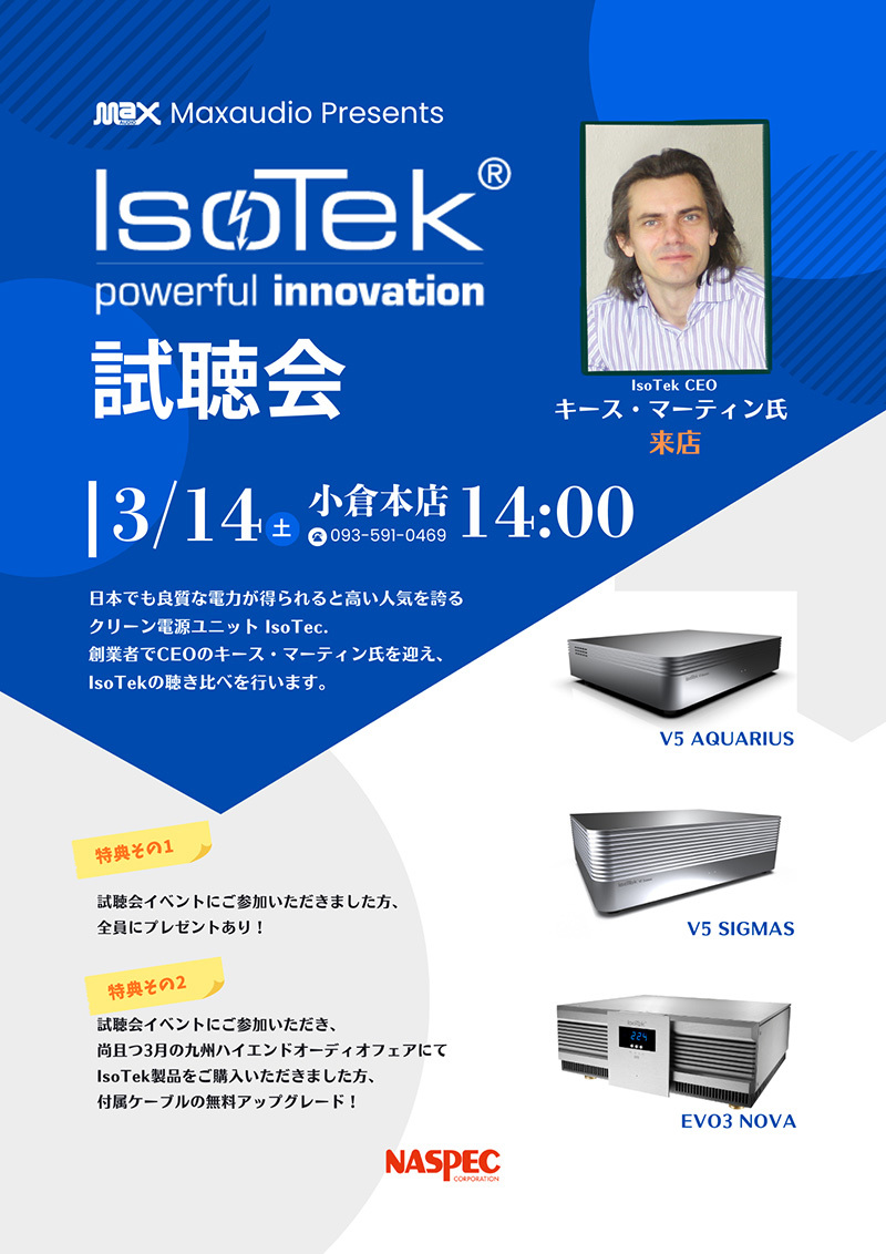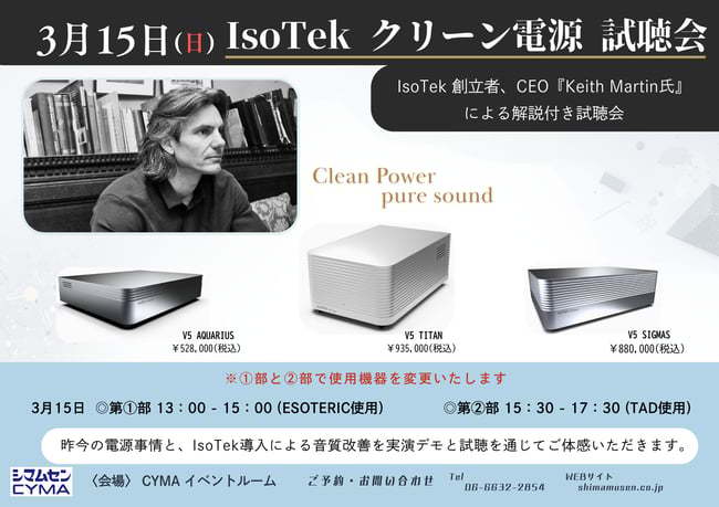 IsoTekのクリーン電源機器を体験できる比較試聴会が、3月14日(土)に福岡のマックスオーディオ小倉本店、3月15日(日)に大阪のシマムセン別館で開催される。