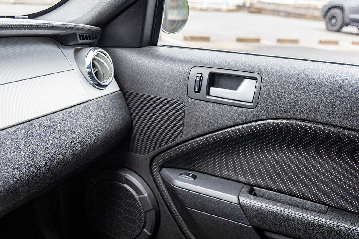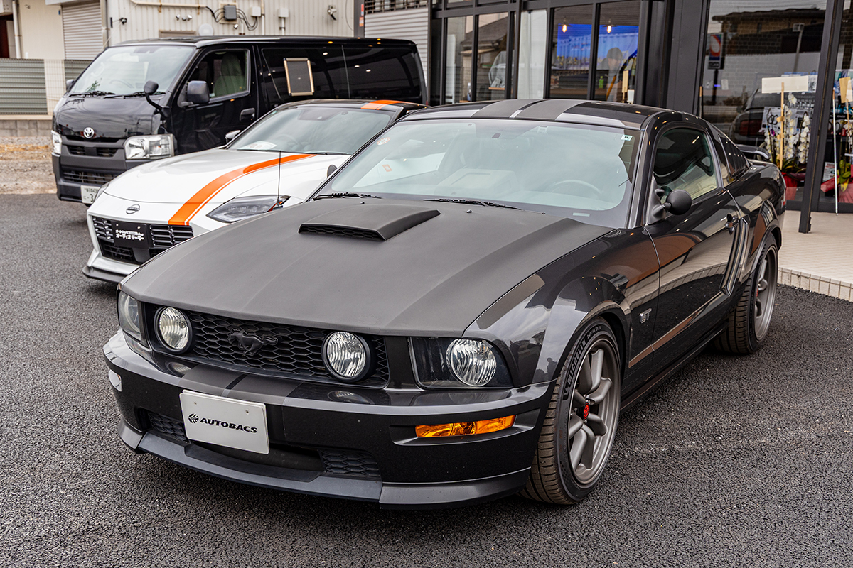 店舗の外には、その時の自動車「マスタング」が置かれていた。これはスタッフの自家用車だそうで、実際に聴くことができる。その効果は歴然。ドアにへばりついていた音が、キチンとフロントガラスに定位し、さらに鮮度感も増したようだ。