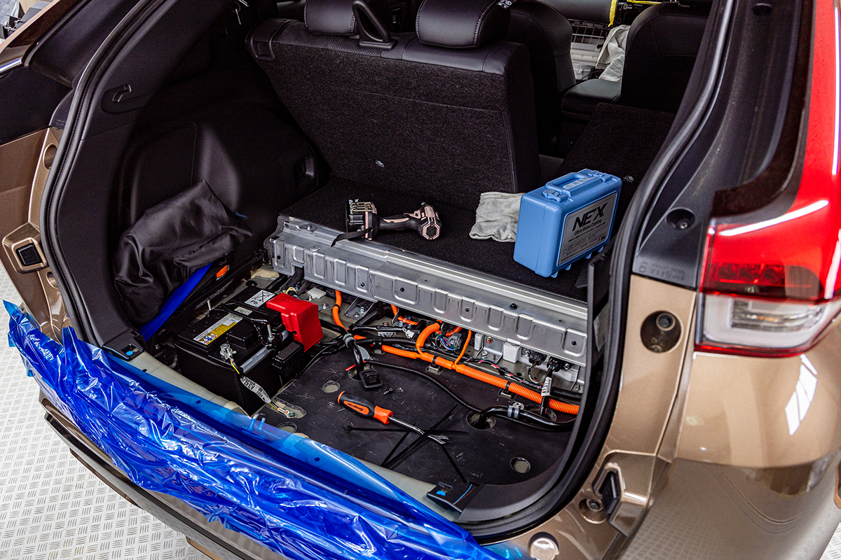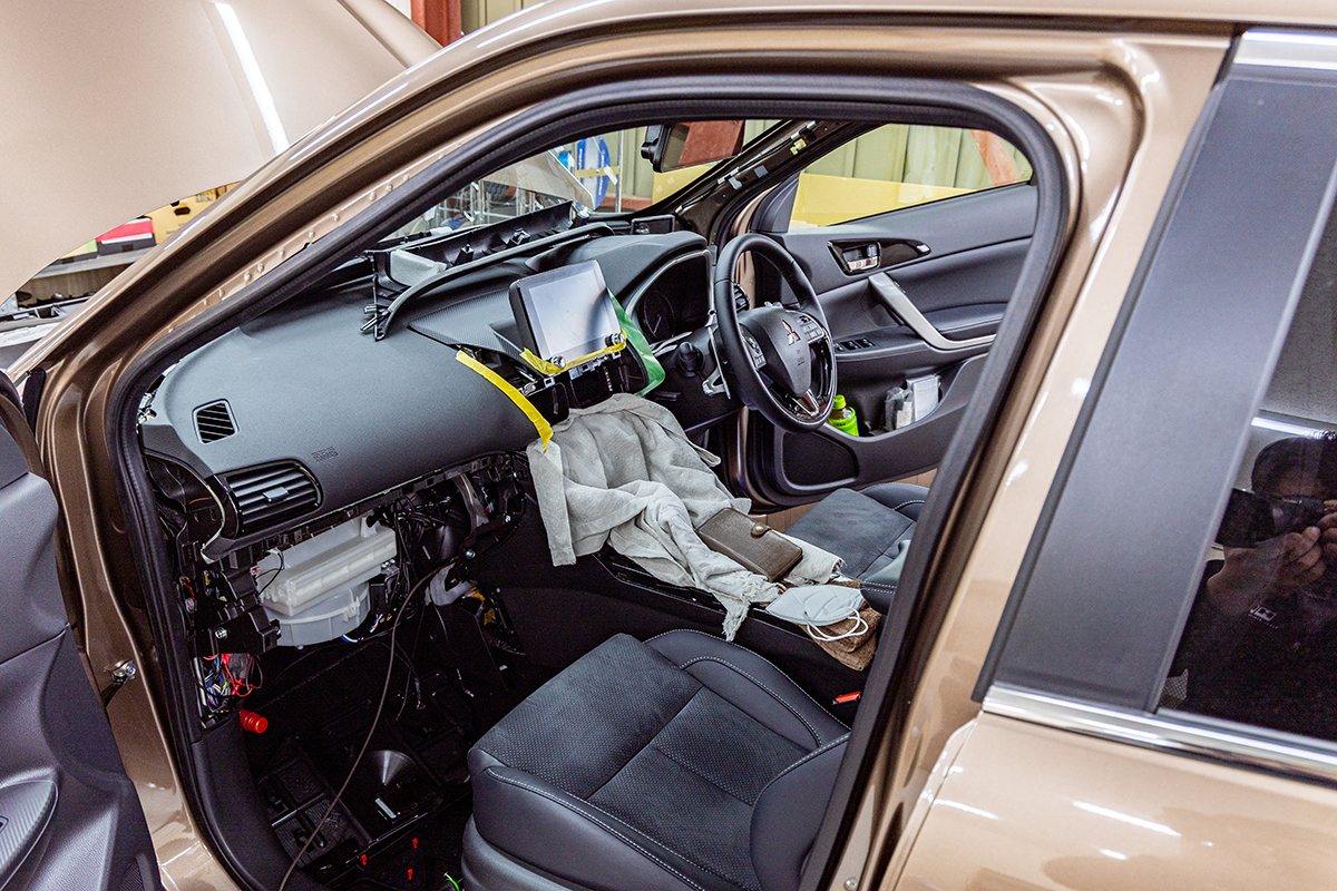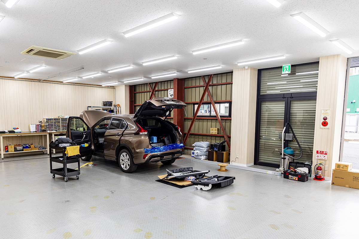 カーオーディオには当然インストール作業が必要だ。そのスペースは店舗の倍以上あり、明るくて綺麗。この日は1台のSUVがDSPアンプやプレーヤーのインストールなどを行っていた。