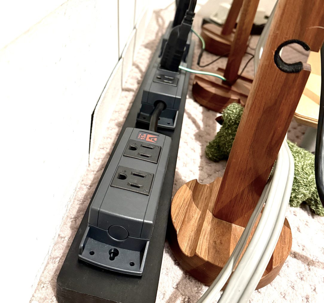 「数珠繋ぎ」の電源タップは、2口のコンセントを複数繋ぎ合わせたもので、タップの間は10cmの間隔が設けられている。バーチ材の電源タップボードはこの電源タップにフィットするサイズとなっており、1個用、2個用、3個用の3種類のサイズを用意。