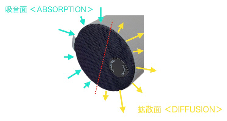 構造は、円柱状の前面を拡散面、背面を吸音面とした複合構造を採用。前面側ではエネルギーを失わずに反射音を拡散し、背面側ではコーナー部で混濁した反射音を効率よく吸収するとしている。