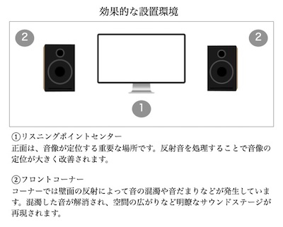 なお、効果的な設置場所として、デスクトップ正面とフロントコーナーが挙げられると同社は説明。デスクトップ正面では、音像が定位する重要な場所の反射面を処理することで定位の改善が見込めるとし、フロントコーナーでは壁面反射による音の混濁や音だまりの低減に効果があるとしている。