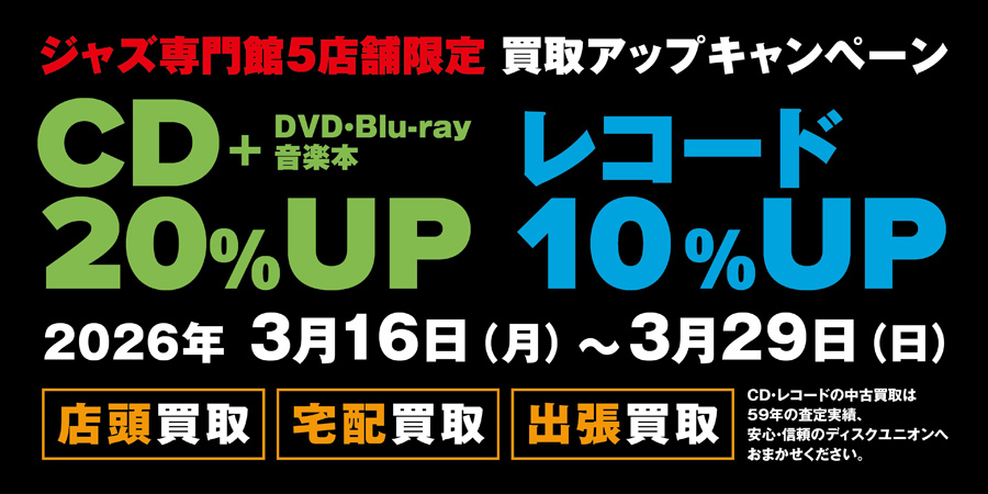 ディスクユニオンは、ジャズのCD/DVD/Blu-ray(ブルーレイ)/音楽本およびレコードを対象とした「買取UPキャンペーン」を、2026年3月29日(日)まで実施する。