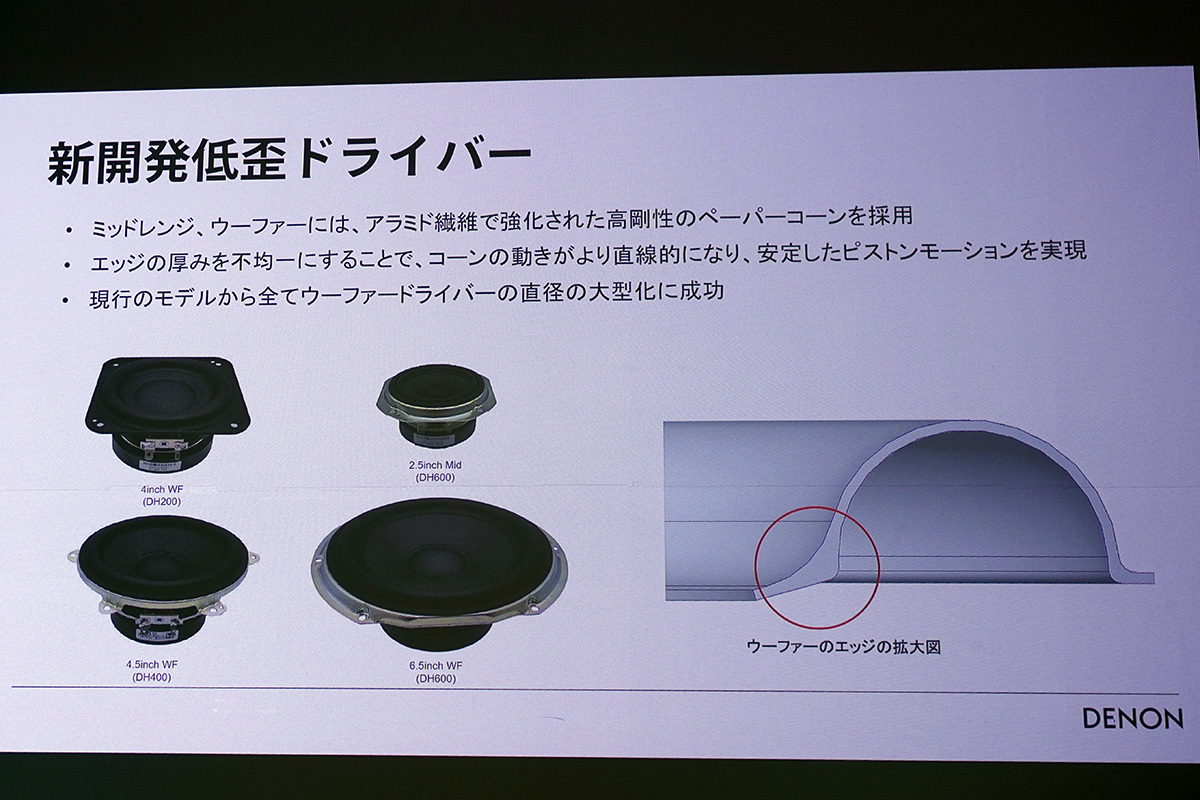 また、エッジの厚みを不均一にすることで、コーンの動きが動きが直線的になり、安定したピストンモーションを実現したという。加えて、従来モデルに比べて、全てのウーファードライバーが大型化している。
