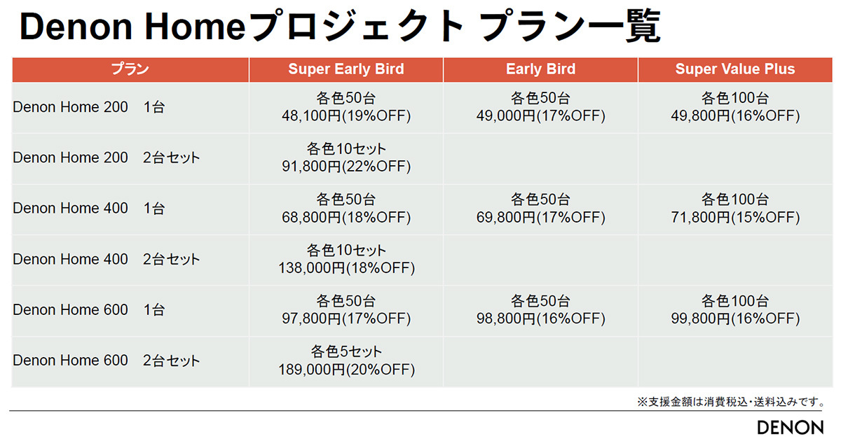 プロジェクト受付期間は6月7日(日)まで。価格は最もコンパクトな「Denon Home 200」のスーパーアーリーバードで48,100円(一般販売価格から19%オフ/税・送料込)から。各モデルともチャコール・ブラックとストーン・シルバーの2色を用意している。