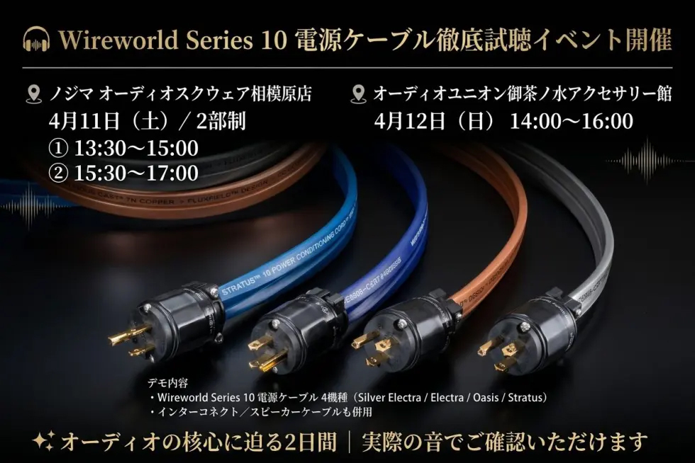 ナスペックの同社取り扱いブランドWireworldより新たに発売された電源ケーブル「Series 10」の比較試聴会が、4月11日(土)に神奈川 相模原で、4月12日(日)に東京 御茶ノ水で開催される。