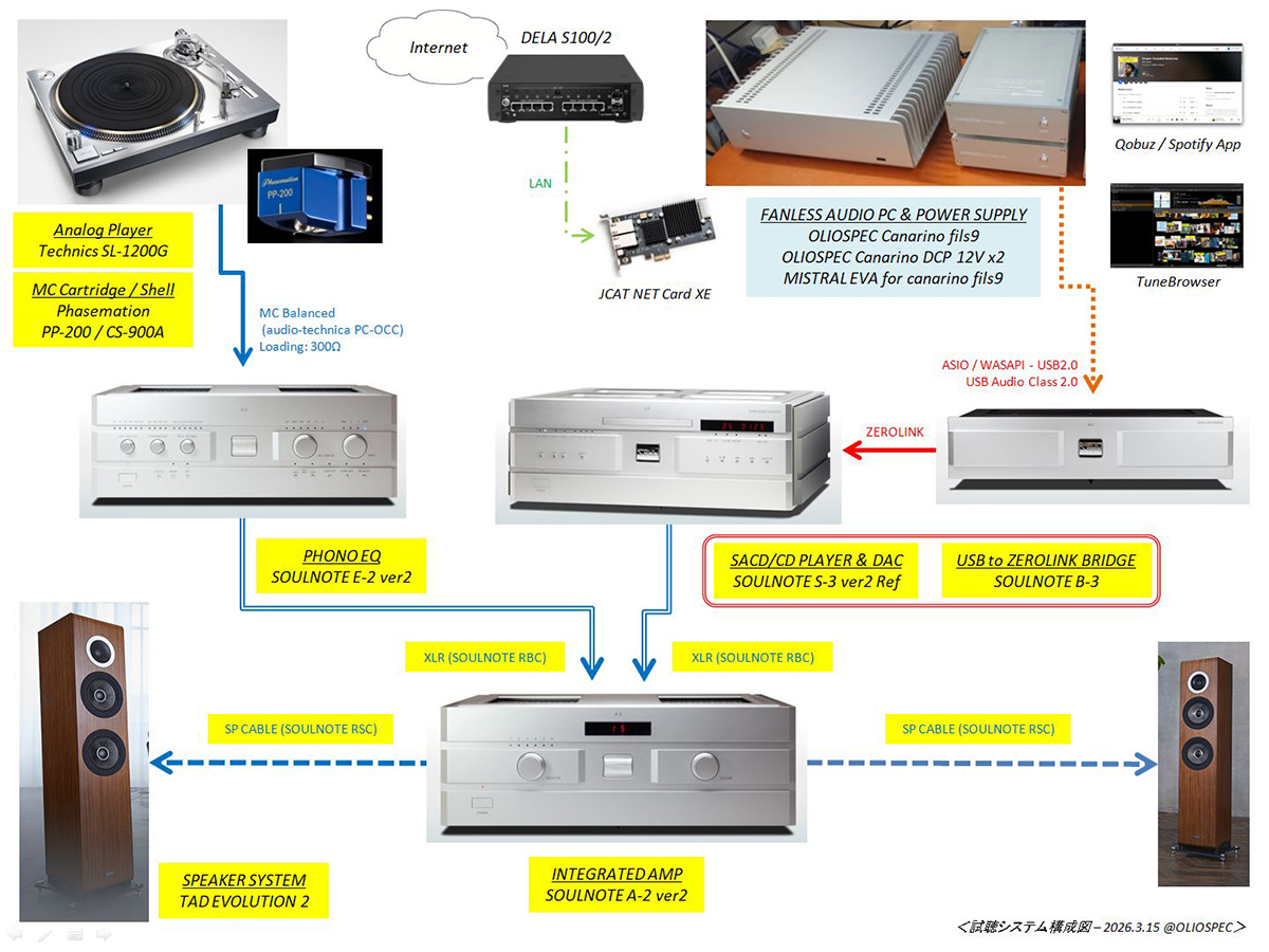 ちなみに今回準備されたオーディオ機器は以下の通り。オリオスペック佐藤氏のこだわりもあって日本ブランドの製品でシステムを構築、LPからハイレゾ、SACDまで最高の音質で楽しませてくれた。