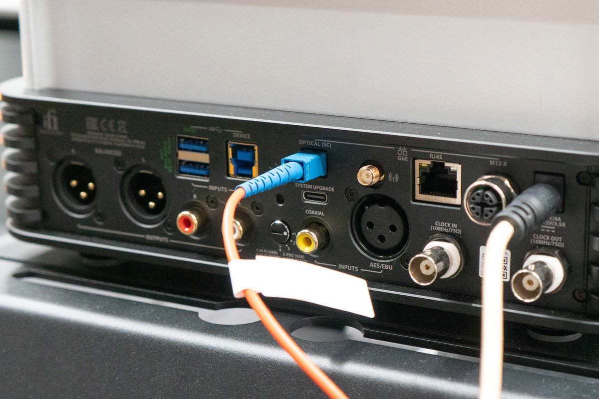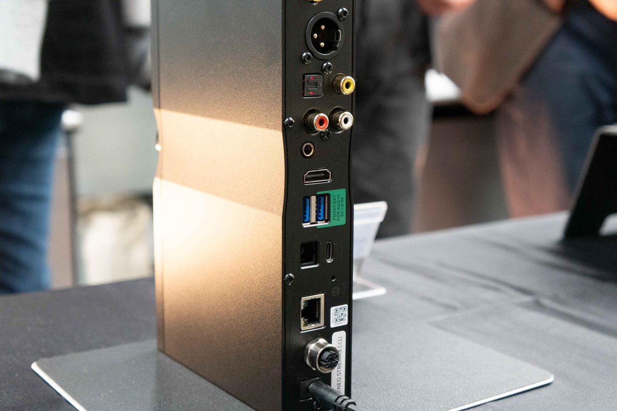 主な入出力端子は、光デジタル音声入力×1基、同軸デジタル音声×1基、USB Type-Aアナログ音声出力×2基(RCA×1、XLR×1)、ヘッドホン出力×6基(3.5mm×1、4.4mm×1、4PinXLR×1、3PinXLR×1、6.3mm正相×1、6.3mm逆相×1)、USB Type-A×2基、USB Type-B×1基、USB Type-C×2基(メディア用/アップデート用)、RJ45×1、M12×1、クロック出力×1基、クロック入力×1基を装備する。