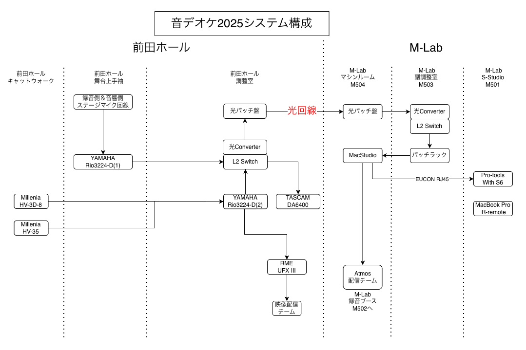 配信の概略は上掲のダイアグラムに詳しい。前述の通り、コンサートが行われる前田ホールと、ミックス作業を行うM-Labのスタジオ間は地中に設置した光回線で結ばれている。