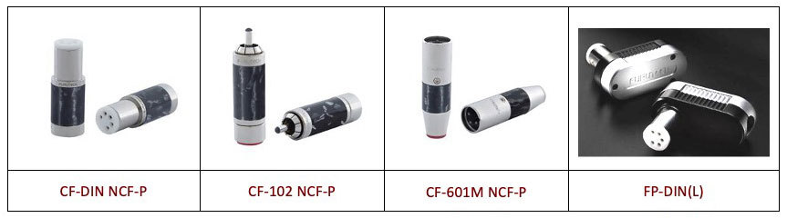 RCA端子「CF-102(R)NCF RCA-P」は、ボディにα銅合金非磁性ロジウムメッキ、ハウジングにハードクリアコート外装とNCFシルバーメッキ3kカーボンファイバー、非磁性ステンレス内装によるマルチマテリアルハイブリッド構造を採用。XLR端子「CF-601M(R)NCF XLR-P」も、純銅素材のα導体やNCF反共振減衰素材、耐熱性NCF液晶ポリマー樹脂を組み合わせた構造としている。なお、コネクターの単品販売は行わない。