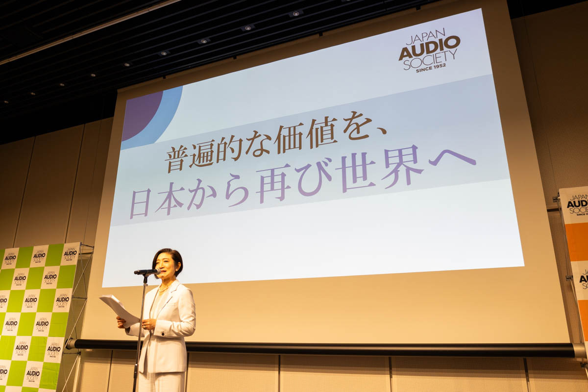 記者会見の冒頭、日本オーディオ協会会長の小川理子氏が挨拶。日本オーディオ協会は1952年に「良い音で音楽を聴く豊かなオーディオ文化を広め、楽しさと人間性にあふれた社会を創造する」ことをビジョンに設立。70年を超え、日本のオーディオ文化は、当時の暮らしの中心であったラジオからスタートして、ステレオコンポーネント、ポータブルオーディオとオーディオ機器の発展とともに成長してきた。