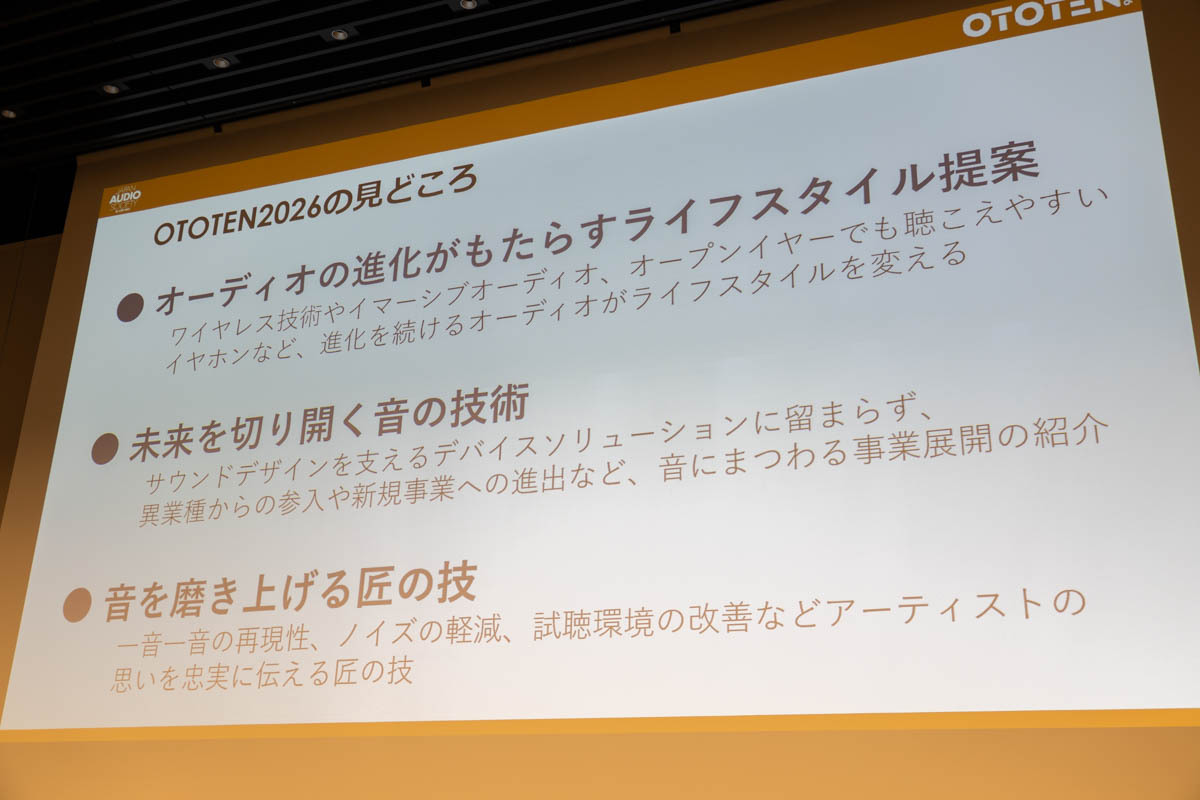 (2)未来を切り開く音の技術については、建設業や宇宙開発など、異業種からオーディオに参入してくる企業が増えていることについて触れ、新しいオーディオの事業展開を紹介。(3)音を磨き上げる匠の技術については、「ザ・オーディオ」の魅力、アーティストの思いを忠実に伝える匠の技を感じてほしいと訴える。