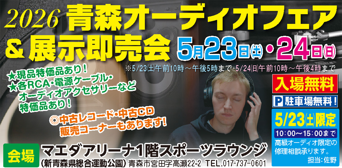 国内外のオーディオメーカーを取り扱う青森のショップ・オーディオパル シラトリは、5月23日/24日に「青森オーディオフェア&展示即売会」を開催する。入場料は無料で、マエダアリーナ1階スポーツラウンジで開催される。
