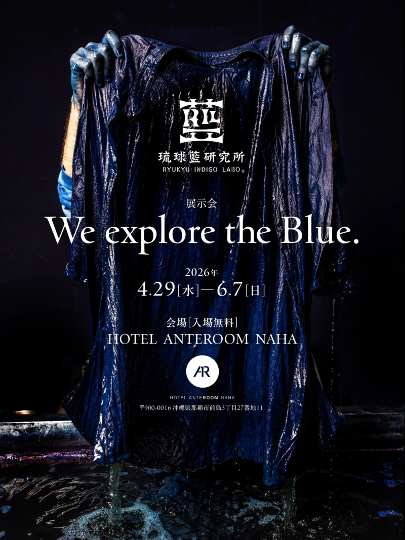 琉球藍研究所初の単独展示会「We explore the Blue.」は、ホテル アンテルーム 那覇のGallery 9.5 NAHAで開催。4月29日(水)から6月7日(日)まで、10時から19時の間開催される。入場は無料。会場では、藍染スピーカーの色と音を実際に体験できる。