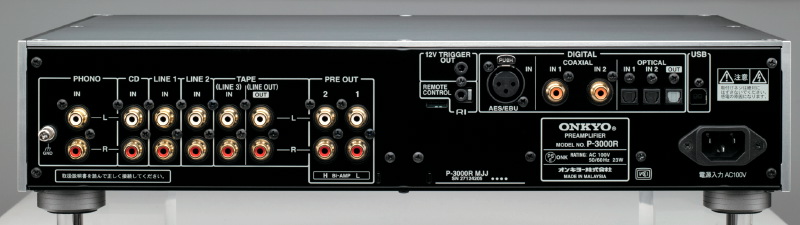 P-3000Rの背面端子部。デジタル入力端子が充実