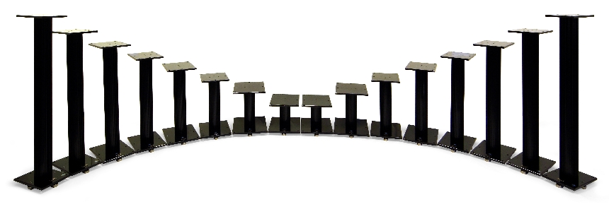 ラインアップは、スピーカーの大きさに合わせて最適な組み合わせを選べるオーダー方式。高さは支柱が20サイズから90サイズの8種類、天板と底板は14サイズから26サイズの7種類と豊富に揃う