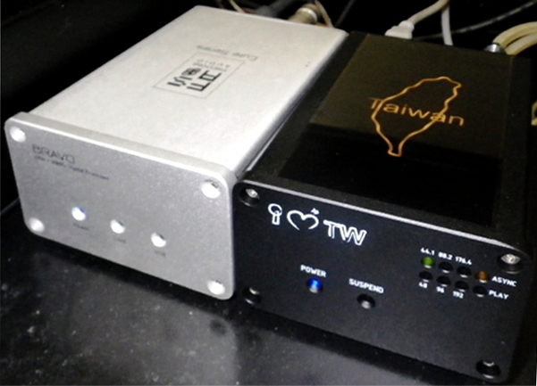 PCオーディオの弱点を克服する高性能USB DAC/DDC「I Love TW」(右)。電源ONでトップパネルにTaiwanのイルミネーションが点灯。既に好評のBravo(左)はジッターを低減し、USB転送時のSN比を改善、一方のI Love TWはジッターゼロを実現するのが大きな違いとのこと