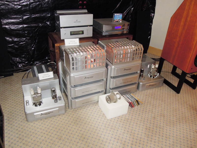 広州のImpressiveブランドのアンプ群。写真手前は出力管に833を使用したモノラルパワーアンプ「SA-833e」。中央は7T85を使用したモノラルパワーアンプ「FA-7T85RB」
