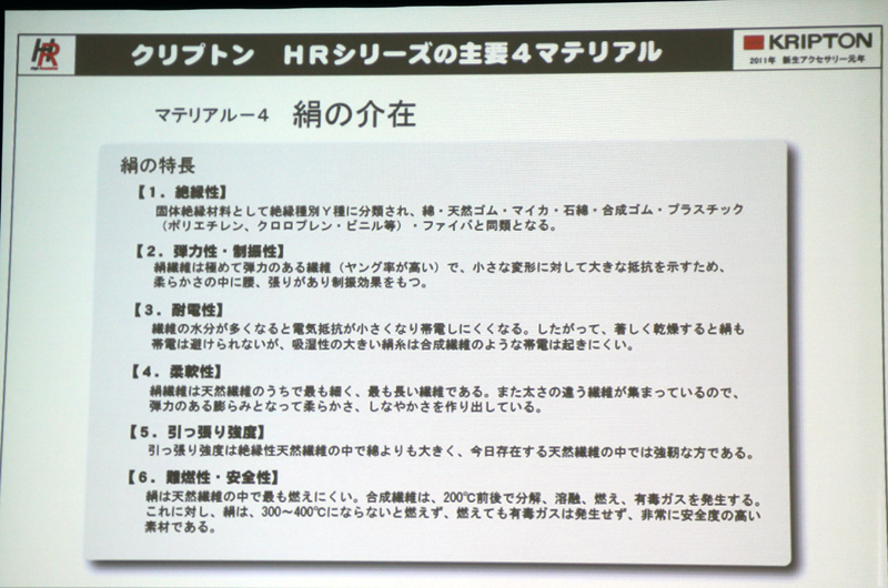 絹は絶縁性・弾力性・耐電性が高く、しなやかで強靱、燃えにくく安全性が高い