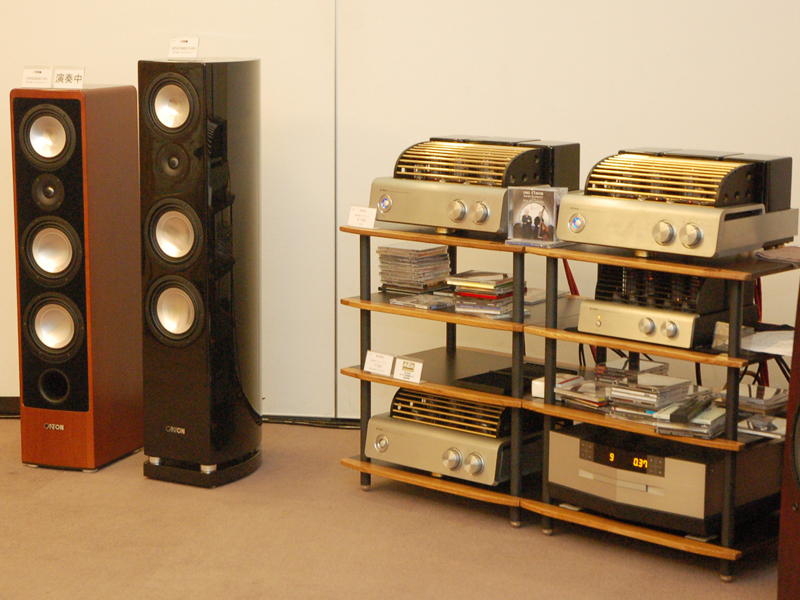 独CANTONのスピーカー(左)の試聴も。デモには真空管プリメイン「T-50」のほか、参考出展の「T-100(左上)」も使用している