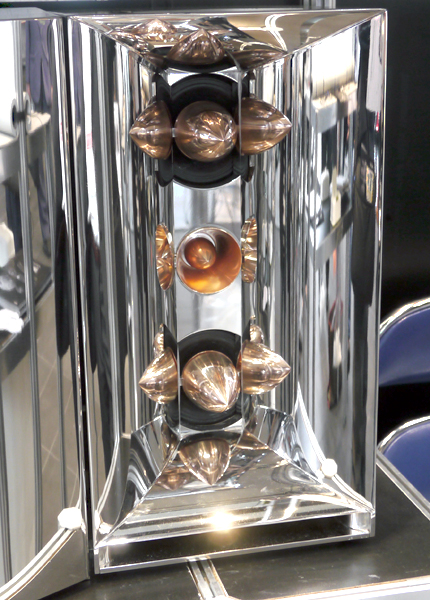 クロム銅ホーントゥイーター採用のステンレススピーカー(参考出展)。重量80kg。こちらよりも小型化したものを、デスクトップスピーカーとして発売したいと検討しているそう。