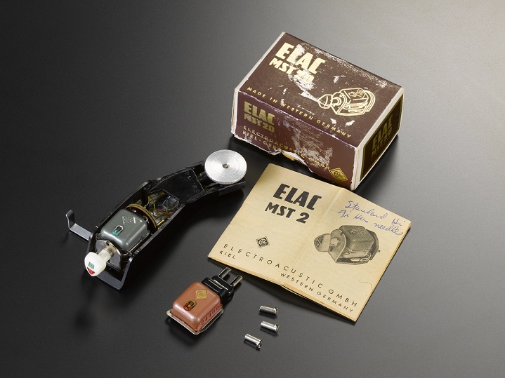 ELACの初期型MMモノラルカートリッジとスタイラス。「Miratwin」は珍しい78回転と33/45回転用の両面タイプ。その他片面タイプの「MST-1」も紹介