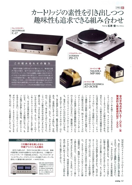 『季刊analog vol.35』の組み合わせレポートの誌面。アナログプレーヤー5×カートリッジ6×イコライザー5モデルの単体レポートと組み合わせレポートを両方掲載!