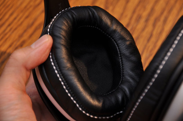 D600のイヤーパッド。低反発素材を用いて装着感を高めたほか、白色のスティッチを配してスタイリッシュなデザインに仕上げた