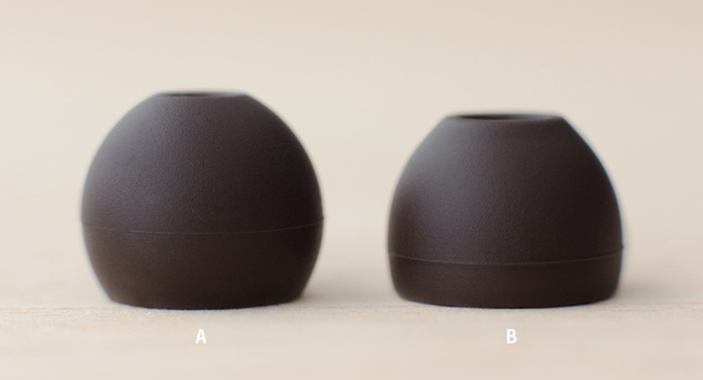 イヤーチップは、遮音性の高いAタイプ(左)と、共振音の少ないBタイプ(右)を用意