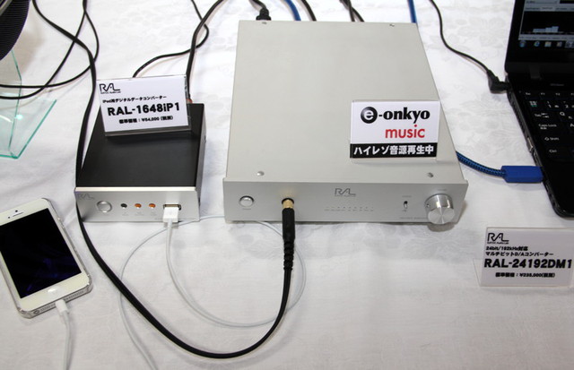 ラトックはデジタル入力対応のUSB-A端子にiPhone 5をつなぎ、問題なく音声を再生できることをアピール