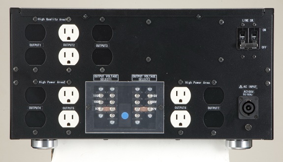 本機のリア部。総出力は2,500VAで以下の3パターンの出力が可能。(1)ハイブリッド型電源=リジェネレーター出力+アイソレーショントランス出力(2)PWMインバーターによるリジェネレーター部出力500VA×1(出力1)