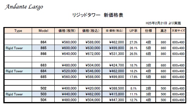 アンダンテラルゴ「リジッドタワー」の新価格表。13年2月21日より実施