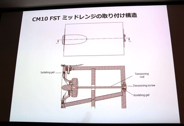 FSTミッドレンジの取付構造。後ろから引っ張るような構造とし、キャビネットとデカップリング化した