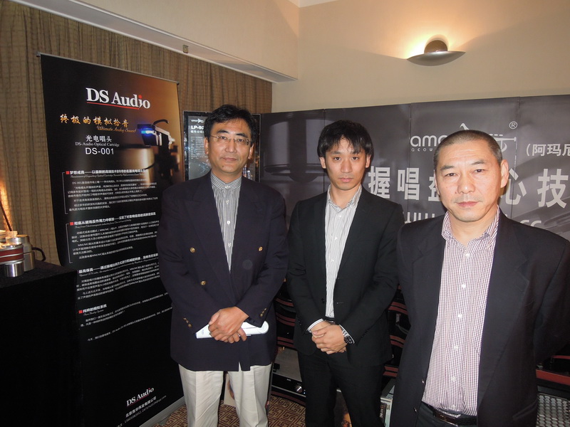 写真中央がDSオーディオの代表である青柳哲秋氏。取材当日も香港のオーディオ誌からインタビューを受けるなど、現地でも大きな話題になっていた