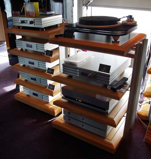 ラック最上段のアナログプレーヤーは、QUALIA JAPANの取り扱いとなるSPIRAL GROOVEのSG2.1J